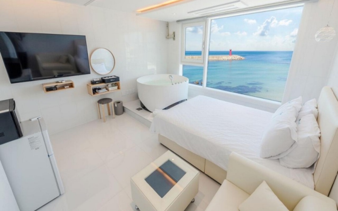 숙소도 화이트 톤의 인테리어로 깔끔하며 루프탑에서 멋진 오션뷰를 배경으로 예쁜 사진을 찍을 수 있는 포토존도 있기 때문에 커플끼리 가시면 예쁜 추억의 사진을 많이 남겨 오실 수도 있을거 같습니다.