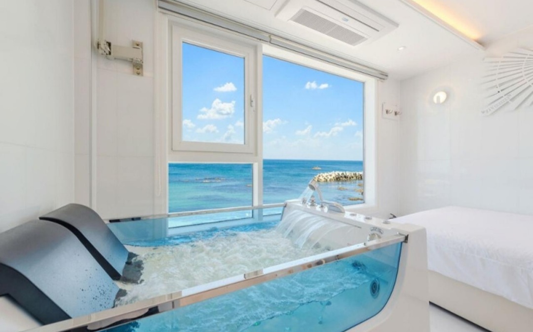 지브펜션의 또 하나의 장점은 스파가 구비되어 있다는 점입니다. 그것도 욕실에 있는게 아니라 사진처럼 멋진 오션뷰를 감상하며 즐길 수 있도록 되어 있습니다. 푸른 바다를 감상하며 즐기셔도 좋으며 혹은 해가 지는 일몰 시간에 즐기셔도 아주 아름다운 경치를 보며 스파를 즐길 수도 있겠습니다.