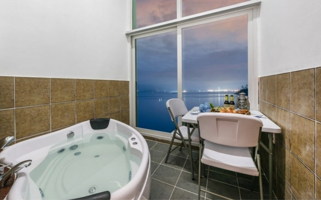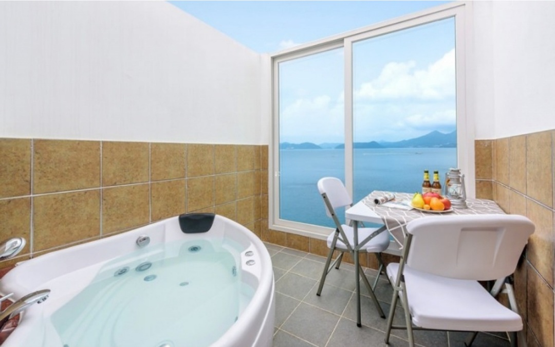거제 휘게 스파의 장점 중 하나는 객실마다 개별 스파가 있다는 점입니다. 야외에 있는 스파는 아니지만 덕분에 비가 와도 언제든 편하게 이용할 수 있으며 실내에서도 바다를 보며 스파를 즐길 수 있는 장점이 있습니다.