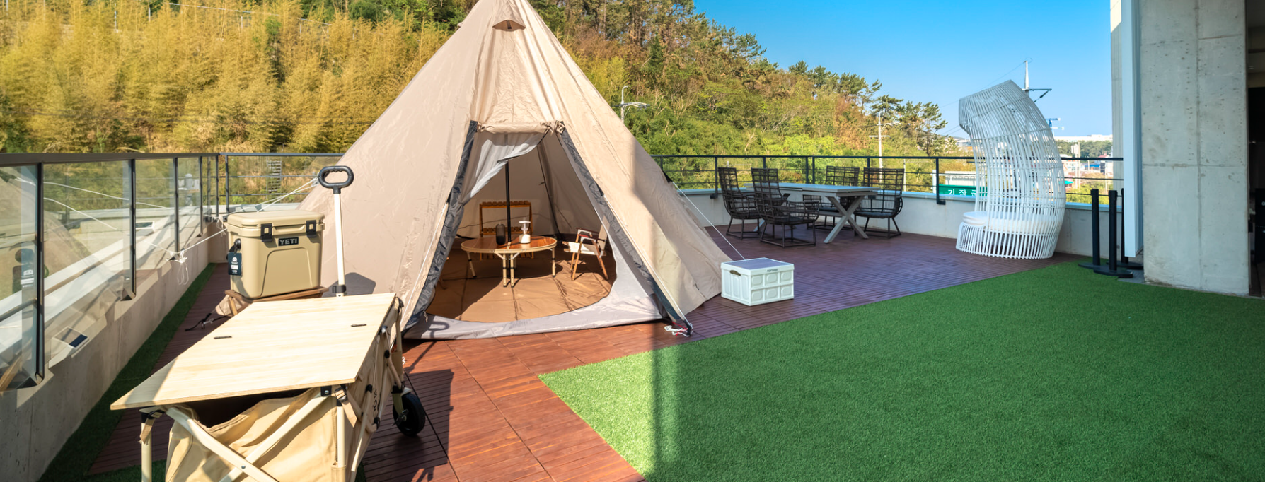 인피니티 테라스 스위트라는 타입은 글램핑 장도 이용하실 수 있는데 10만원의 금액이 따로 발생되니 참고해 주시길 바랍니다. 객실마다 실내, 혹은 야외 테라스가 있는데 이곳에서 2만원의 금액으로 바베큐도 이용이 가능하십니다. 바베큐 재료는 따로 제공되지 않으니 미리 장을 보시는걸 권해드립니다.