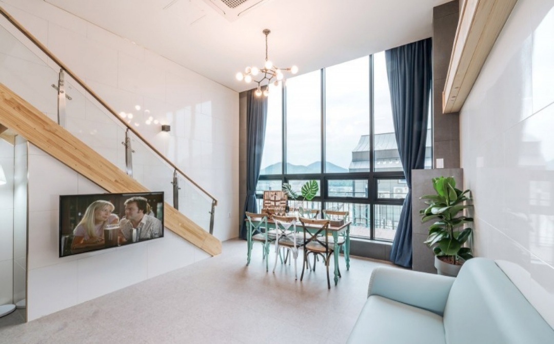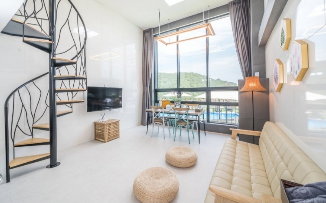 객실은 보시다시피 복층 구조로 되어 있고 1층은 거실, 화장실, 주방이 있고 2층에 침대가 있는 형식입니다.