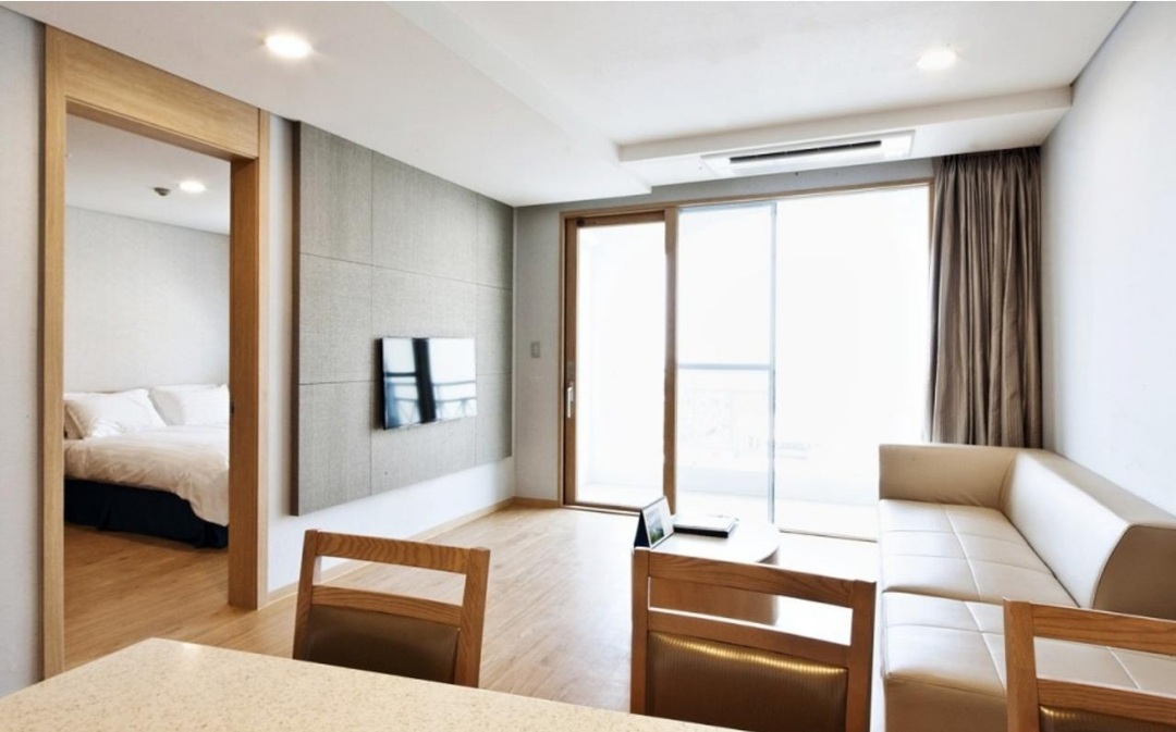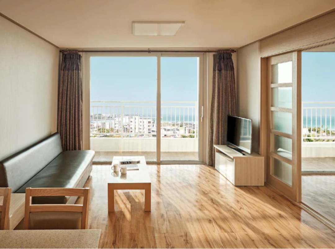 사진으로는 잘 안보이지만 함덕 해수욕장이 근처에 있기 때문에 고층으로 배정 받으면 해변가를 볼 수 있습니다.